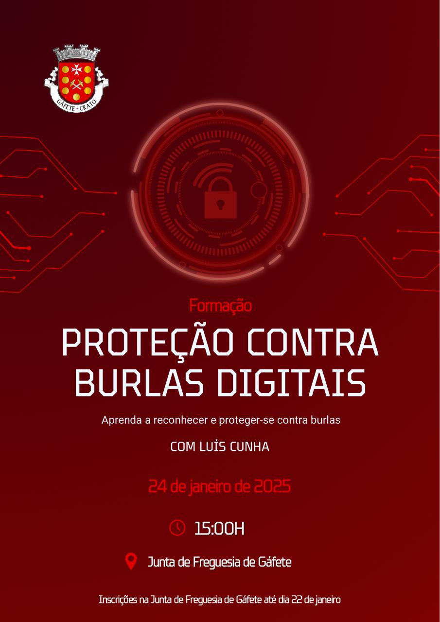 A Junta de Freguesia de Gáfete, no próximo dia 24 de janeiro, realizará, a partir das 14h45, uma ação de formação aberta à comunidade, com o objectivo de informar e sensibilizar a população sobre os riscos associados às burlas online e as medidas de prevenção que todos podem adoptar para se proteger.